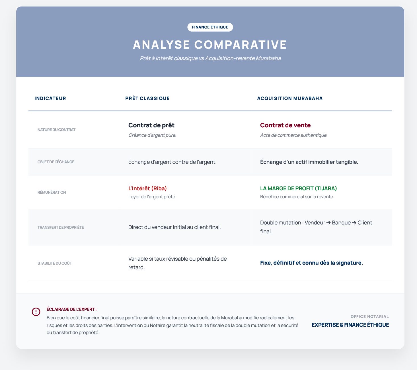 Conformément aux exigences de la finance éthique et aux précisions du BOFIP, le notaire certifie la nature de la transaction : il ne s’agit pas d’un flux monétaire abstrait, mais d’un investissement dans un actif tangible. Son contrôle s’étend sur l’opération globale : il porte sur l’absence totale de Riba et sur la matérialité de l’achat par le financier, condition sine qua non pour que la marge de profit soit fiscalement et juridiquement licite.
